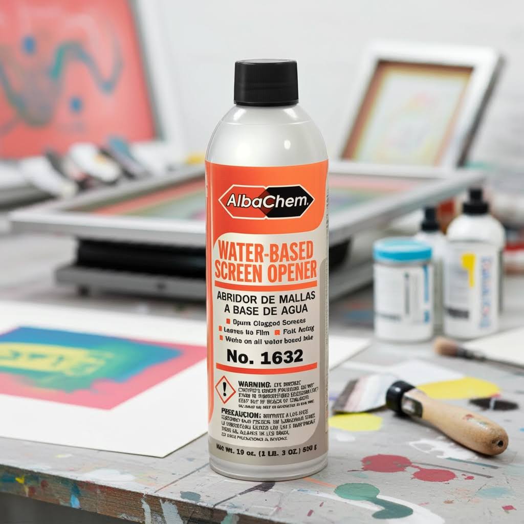 AlbaChem Water-Based Screen Opener safely opens clogged screens of dried ink. The foaming cleaner works fast without leaving any film or oily residue. It may also clean ink and dirt from the printing presses