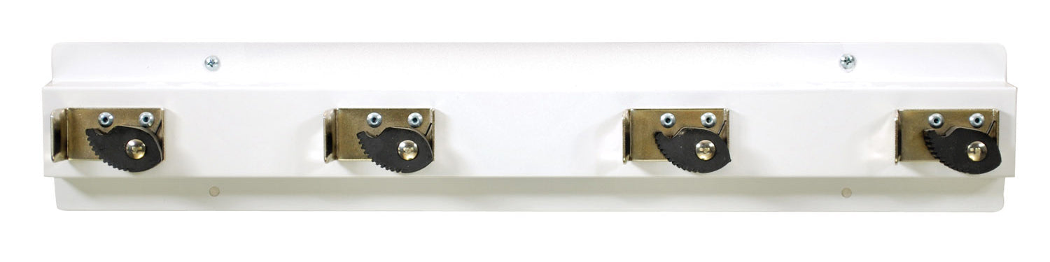 The Economy Mop & Broom Holder is constructed of heavy-duty steel with a White Gloss (WHT) powder coat finish.