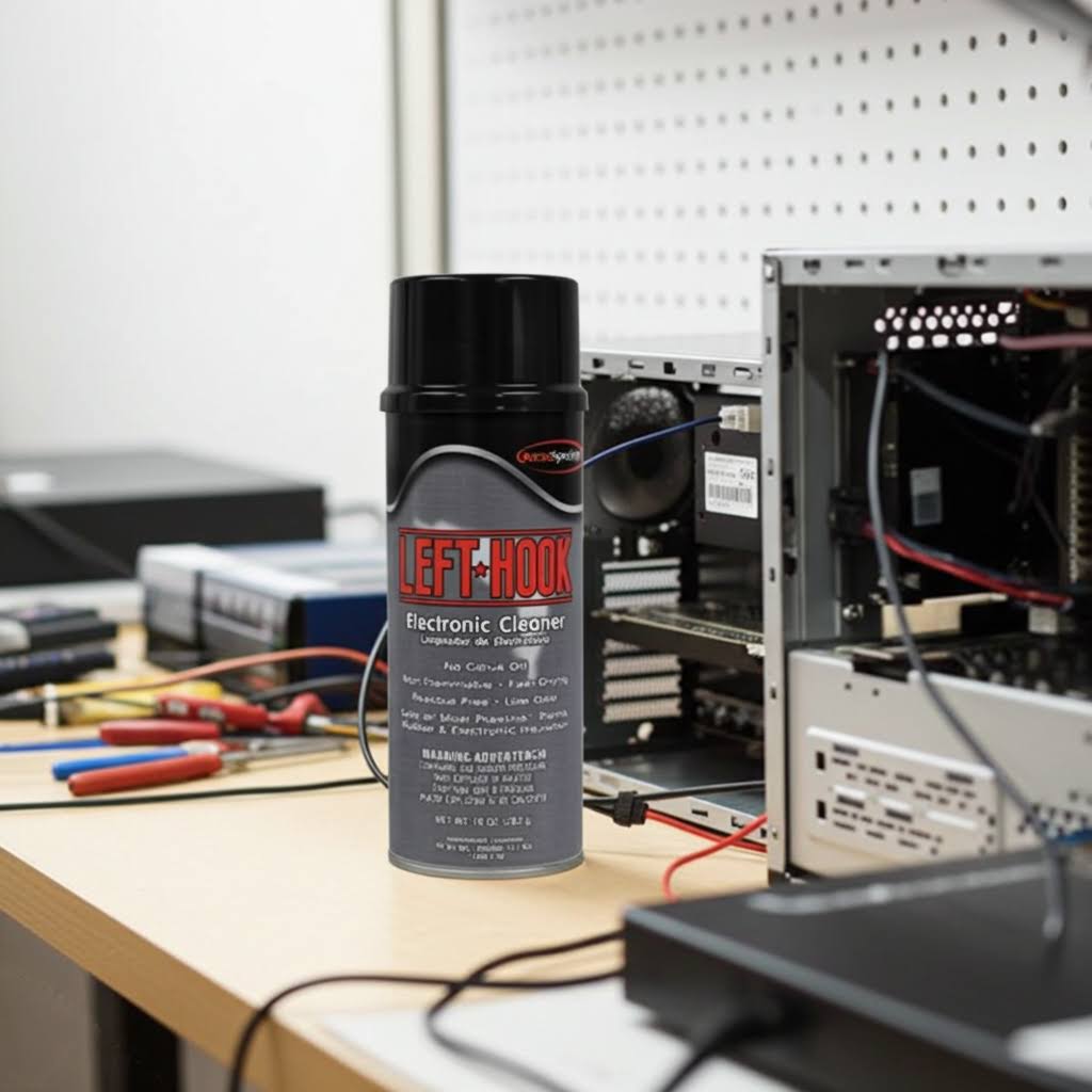 LEFT HOOK is a high purity, high dielectric, rapidly evaporating, non-flammable spray formulated to remove oil, grease, condensation, and other contaminants from sophisticated electronic parts. Ideal for removing grease and dirt from sensitive electronics, televisions, and telephone equipment.