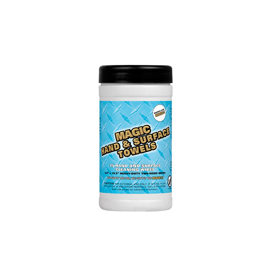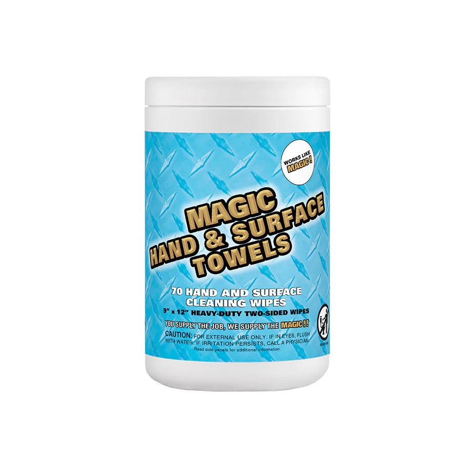 A multi-purpose, pre-moistened wipe formulated to remove grease, oil, dirt, brake dust, water-based inks, and grime from hands and a variety of non-porous surfaces without the use of water. Disposable towels that are perfect for use anywhere, anytime.