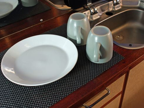 Holds objects firm on surfaces that are not horizontal and/or are subject to motion or tipping i.e use as a table mat on boats, motor homes and RV’s