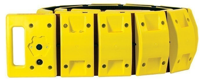 Aervoe Portable Speed Bumps are designed for temporary placement on roads, parking lots, warehouse floors, etc., to slow vehicle speed. Each of the 25 yellow plastic body pieces has high-intensity reflective conspicuity tape on the front and back for visibility. Both ends of this Speed Bump have molded handles to use to unroll and maneuver it into position. Four of the sections have bright yellow LEDs on the front and back for greater visibility – night or day. These sections are evenly spaced across the length of the Speed Bump. One handle contains a rechargeable lithium-ion battery and recharges using a unique magnetic charging adapter. A plug fits into the charging cavity when the Speed Bump is in use or not charging. It has 3 light patterns (slow flash, quad flash, and steady-on).
