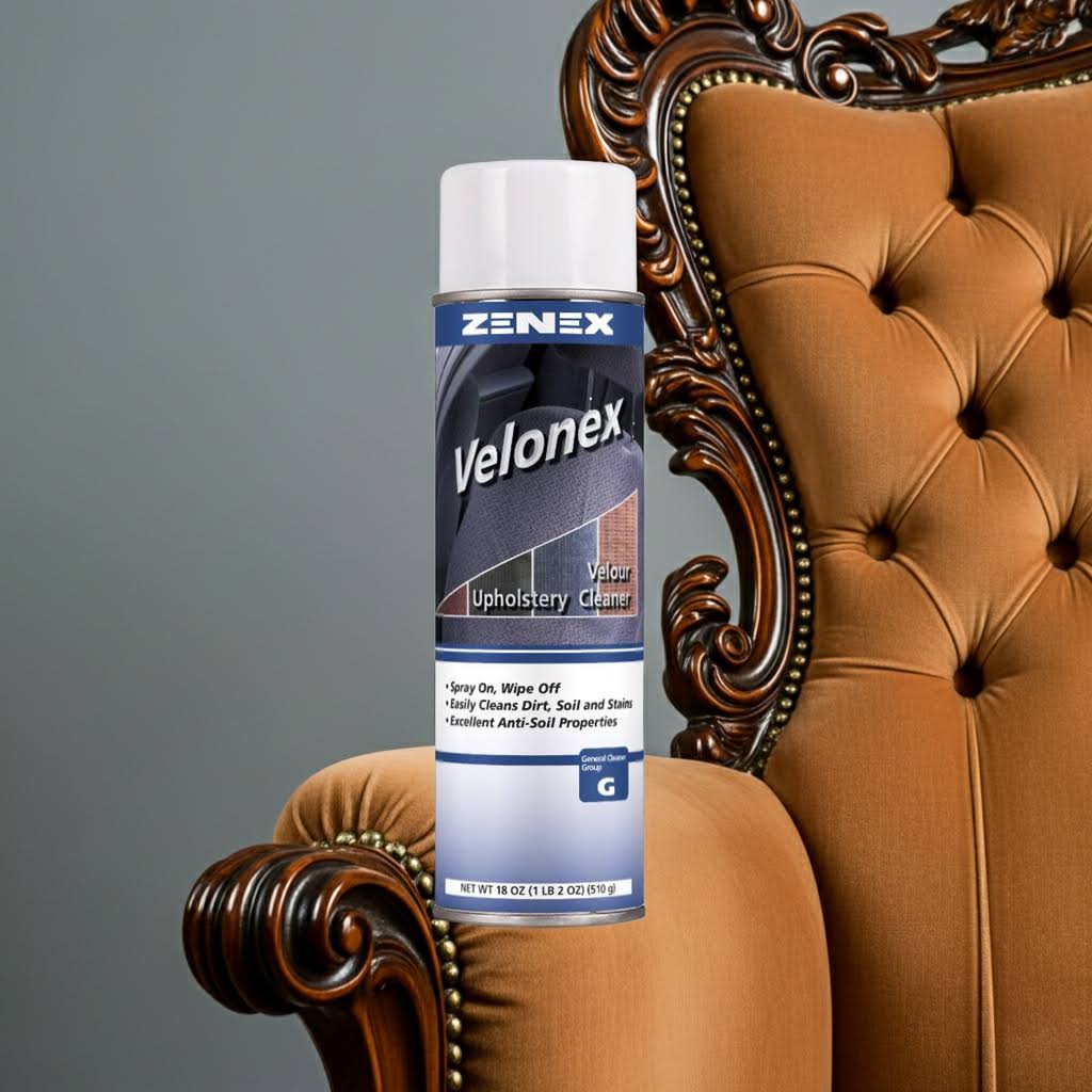 Velonex Velour & Upholstery Cleaner-UPRIGHT SPRAY - Quick clean velour cleaner lifts out dirt and grime, holding it in suspension until vacuumed away. Velonex contains detergents specifically designed for velours. Use on spills right away to help avoid hard-to-remove stains later. A great powerful foaming cleaner for velour furniture or auto interiors.